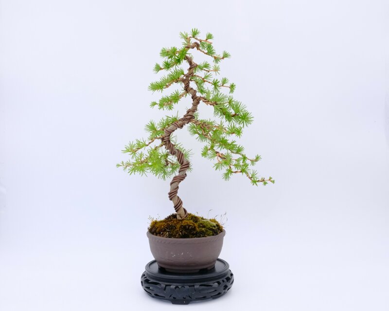 Gabriella est superbe ! C'est un très beau mélèze du japon, plutôt classique mais très harmonieux et délicat, avec un bel équillibre et déjà beaucoup de style. Le tronc est prometteur, bien conique et naturel, comme sur des arbres sauvages de montagne. Les branches sont très bien positionnées, nombreuses et déjà très bien ramifiées. Le sujet est de belle dimension, et avec déjà un volume intéressant.